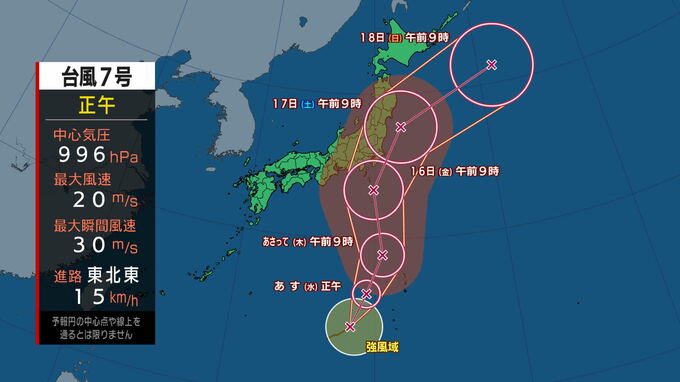 台風7号は13日正午現在、日本の南にあって時速15キロの速さで東北東に進んでいます。中心気圧は996ヘクトパスカル、中心付近の最大風速は20メートルです。
