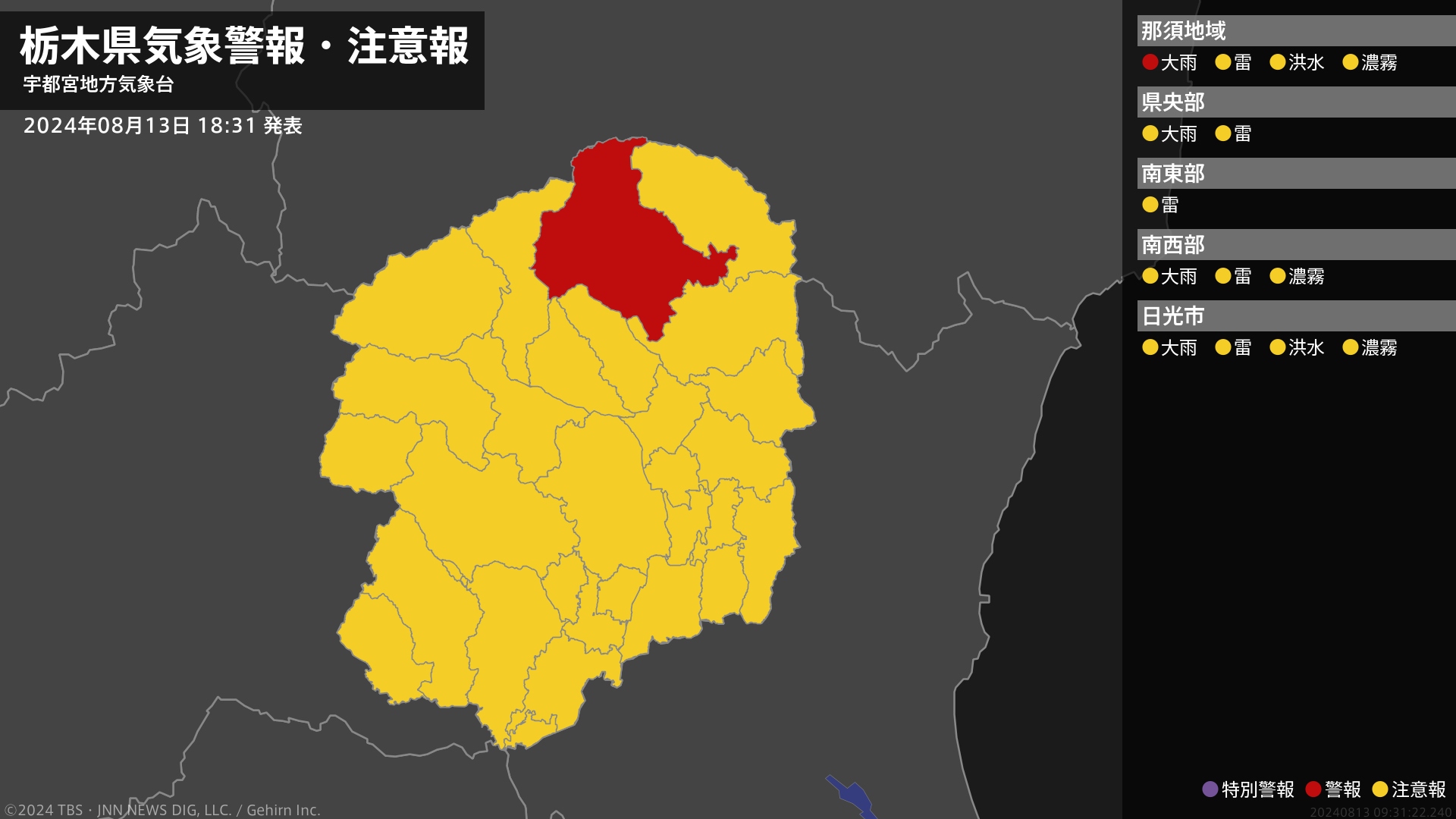 気象台は、午後6時31分に、大雨警報(浸水害)を那須塩原市に発表しました。