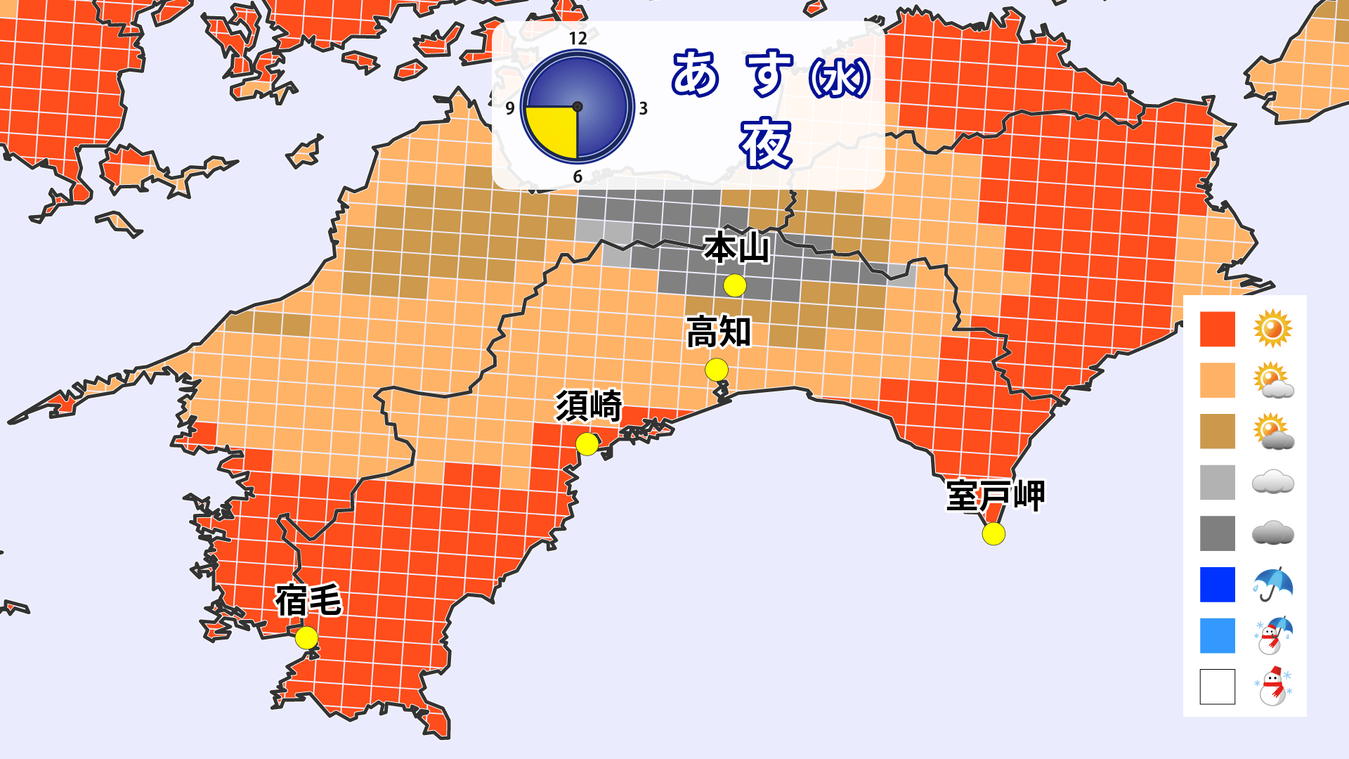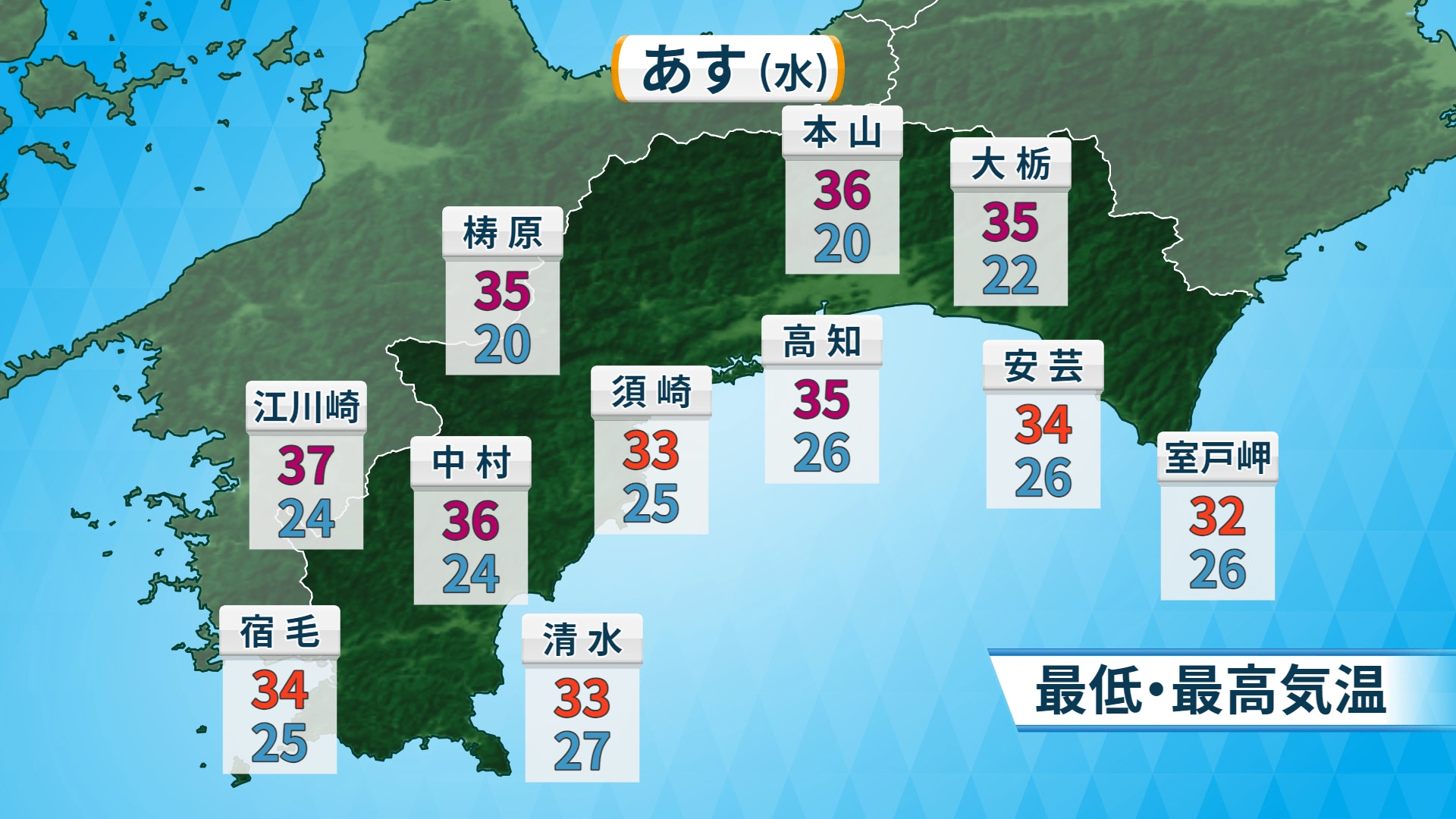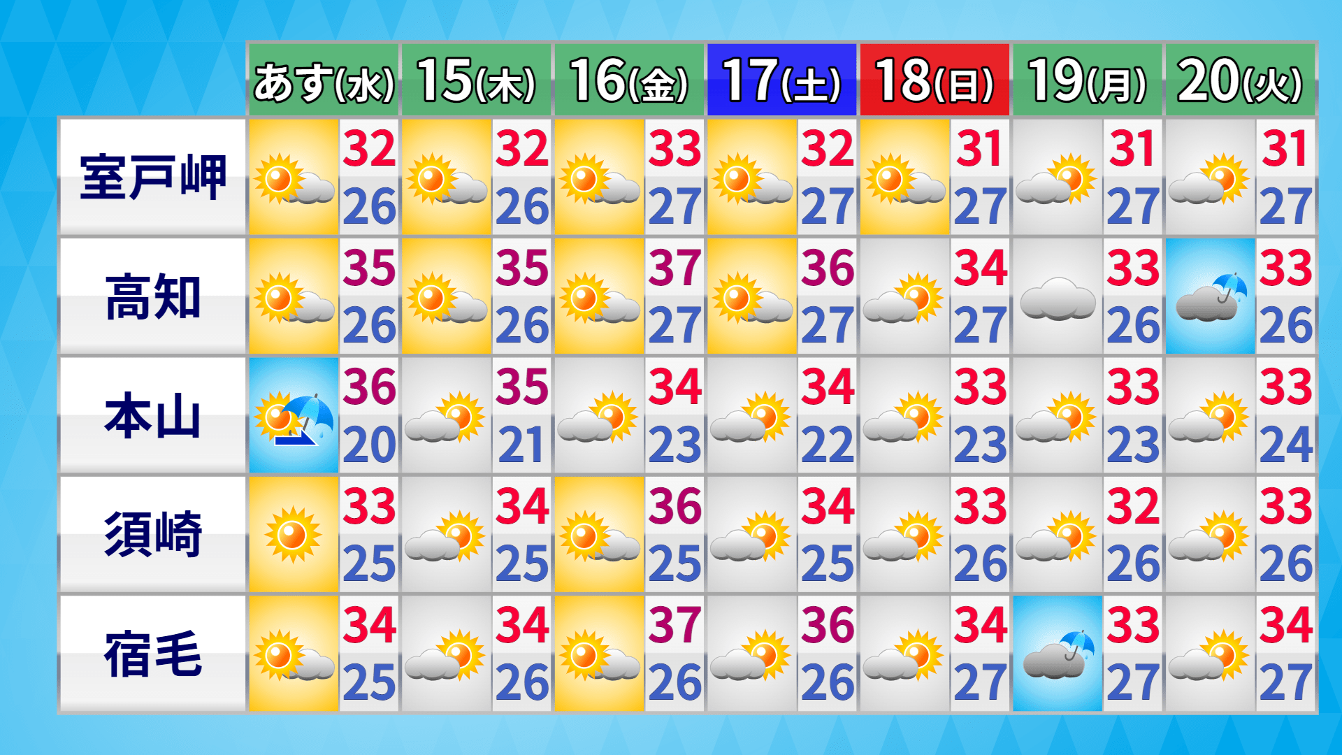 最低気温は平野部で25度を超えて熱帯夜となるでしょう。日中の最高気温は高知市で35度、四万十市で37度と各地で猛暑日となる見込みです。昼夜問わず熱中症に警戒をしてください。