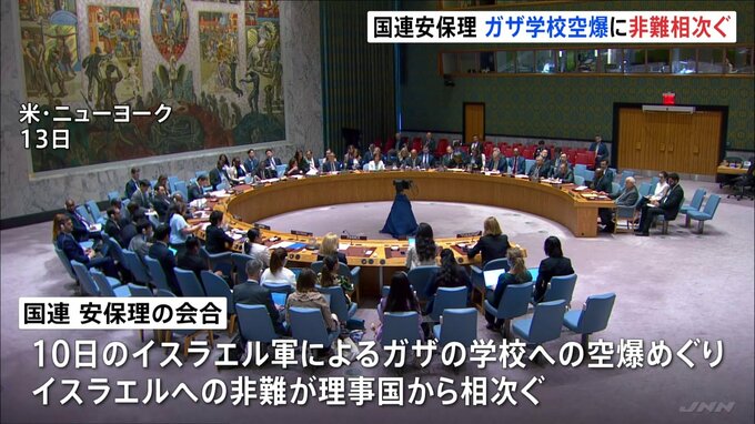 国連の安全保障理事会の会合で、先週末に100人以上が死亡したパレスチナ自治区ガザの学校への空爆をめぐって、イスラエルへの非難が相次ぎました。国連日本代表部 志野光子 次席大使「学校や病院で多数の民間人…