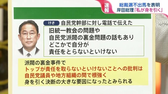 ただ岸田総理は内閣支持率が低迷している中で、あくまで続投に向けた考えは崩していなかったんですけども、周囲に対して「もし自分が出ないとするならば、その理由は自分がいると総選挙で皆に迷惑をかけるから」と語っていました。