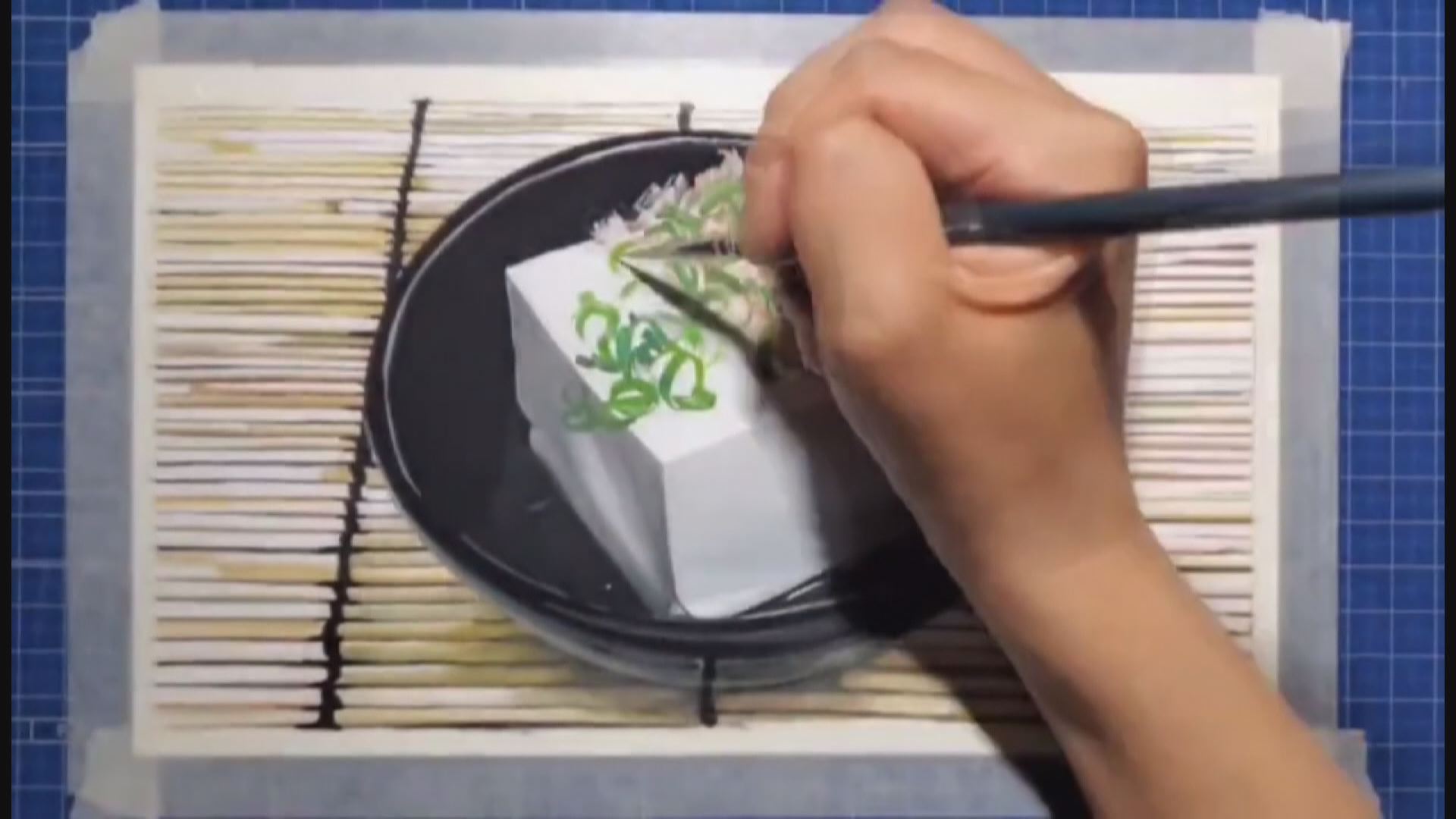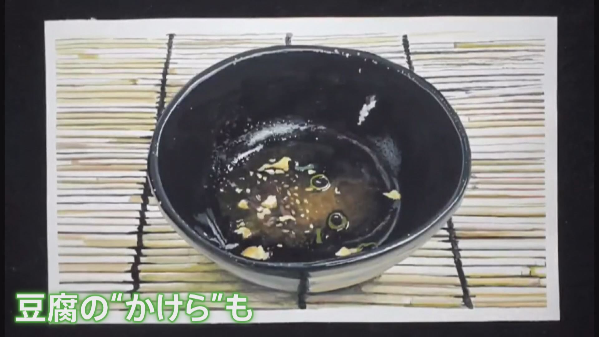 こちら、紙の上に絵の具で描かれているのは“冷や奴”。鰹節に、ねぎ、さらに生姜まで忠実に再現されています。さらに凄いのは、ここから。冷や奴がドンドン食べ進められていき、最後には完食。器には食べ終えた後の“かけら”まで細かく描かれています。