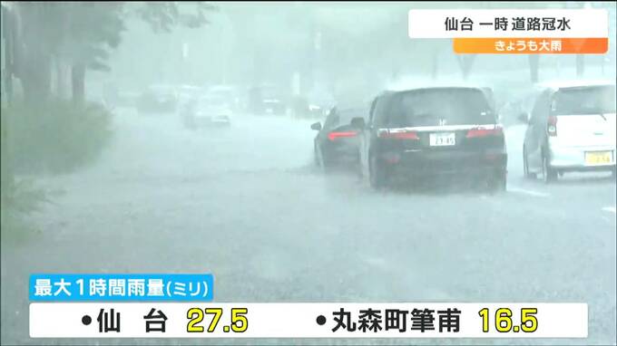 この大雨は、台風5号から変わった熱帯低気圧の影響が長引き、大気の状態が不安定となっているためで、最大1時間雨量は、仙台で27.5ミリと、道路が一時、冠水するほどの強さでした。