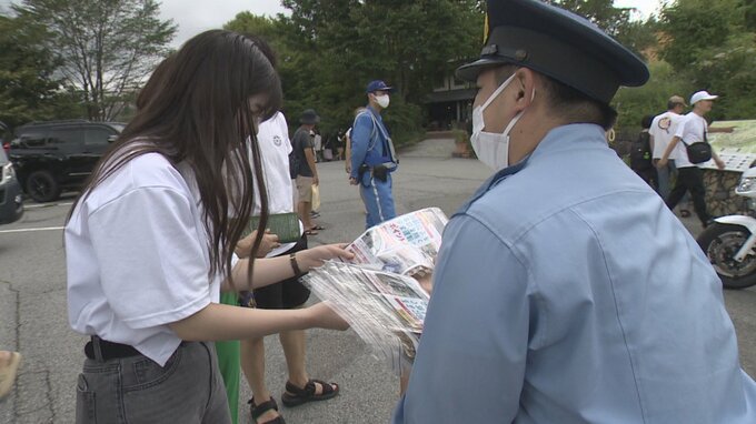 警察官らは萌木の村のレストランROCKの敷地内で飲酒運転の防止や安全運転のポイントをまとめたチラシなどを観光客に配り交通安全を呼びかけました。