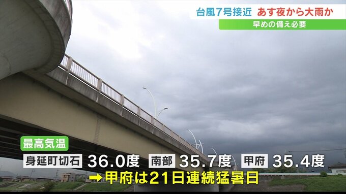 台風7号は16日に山梨県内に最も接近し、15日の日中から雷を伴った激しい雨が降る見込みで、気象台は早目の備えを呼びかけています。