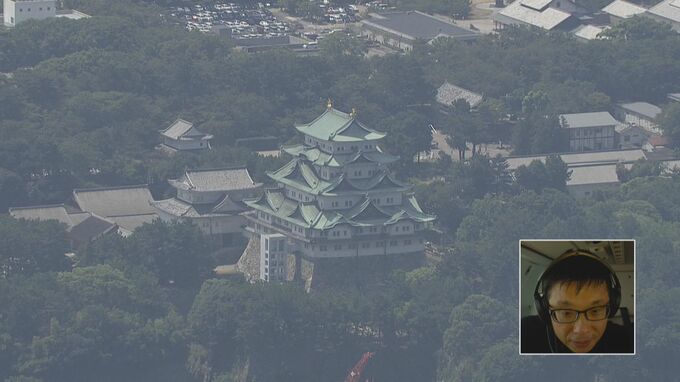 「見えてきました、名古屋城。太陽の光に照らされて、金の鯱(しゃちほこ)が輝いています。お客さんの姿が見えますね。パイロンが立てられていて行列があります。ほとんど皆さん、日傘をさしていますね。帽子をかぶっている方がほとんど。そして帽子をかぶっていない方は、日傘をさしています」
