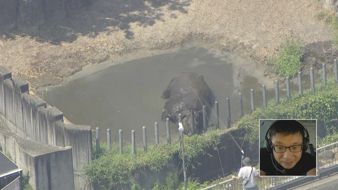 「その様子を見ている帽子をかぶったお客さん、日傘をさした女性もいらっしゃいます。ゾウのお尻を捉えています。でもゾウはなかなか日なたに出てきません。ゾウもこの暑さは少し堪えるようです」