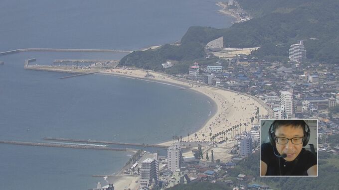 「見えてきました白い砂浜、内海海水浴場です。海水浴客の姿が見られます。