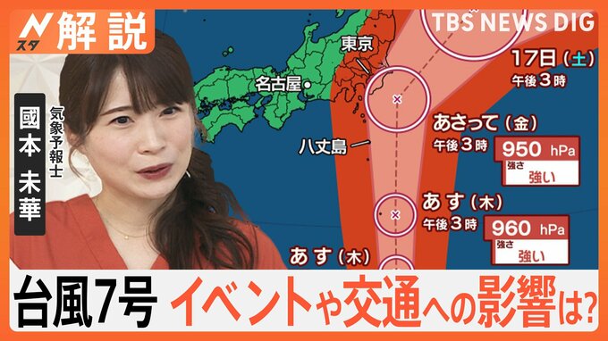 台風7号は16日に関東に直撃する恐れが出ています。お盆のイベントの中止や延期が相次ぎ、交通への影響も大きくなりそうです。國本未華 気象予報士:14日午後3時、台風7号は父島の西南西に位置し、海面水温が約30…