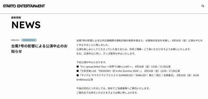 台風7号の影響による公共交通機関の運転計画の発表を踏まえ、8月16日(金)の公演中止を発表しました。
