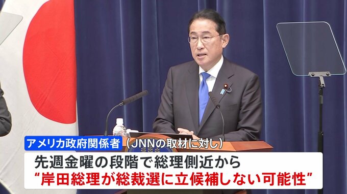 岸田総理の自民党総裁選への対応について、総理側がアメリカ政府に先週金曜の段階で“立候補しない可能性がある”という見通しを伝えていたことがJNNの取材でわかりました。岸田総理が来月にも予定される自民党総…