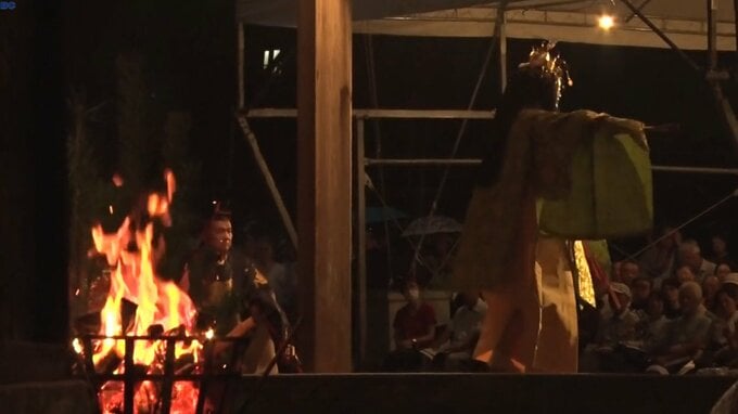 訪れたおよそ600人の観客は、かがり火に照らされた幻想的な舞台を堪能していました。