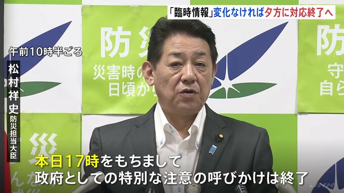 南海トラフ地震臨時情報「巨大地震注意」の発表からきょうで1週間です。防災対応の呼びかけは、地震活動などに変化がなければ、きょう夕方に終わる見通しです。松村祥史 防災担当大臣「このまま地震活動や地殻変…