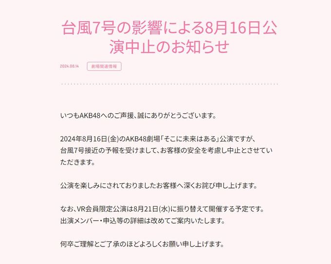 公式サイトでは「いつもAKB48へのご声援、誠にありがとうございます。」と書き出し、「2024年8月16日(金)のAKB48劇場「そこに未来はある」公演ですが、台風7号接近の予報を受けまして、お客様の安全を考慮し中止とさせていただきます。」と発表。さらに「公演を楽しみにされておりましたお客様へ深くお詫び申し上げます。 」と綴りました。