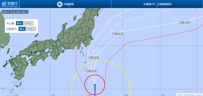 強い台風7号は、発達しながら北上し、15日15時には八丈島の南南東約310キロにあって、1時間におよそ15キロの速さで北へ進んでいます。中心気圧は965ヘクトパスカル、最大瞬間風速は50メートルで、16日は暴風域を伴って非常に強い勢力で、伊豆諸島や関東地方に接近するおそれがあります。