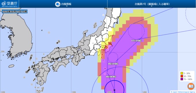 気象庁ホームページの「暴風域に入る確率」では、千葉県と伊豆諸島の広い範囲が70~100%、東京都、茨城県、福島県の一部が30%~70%となっています。