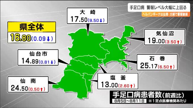 手足口病は5歳以下の子どもに多く手や足、口の中などに発疹ができる感染症です。宮城県によりますと8月11日までの1週間に県内55の定点医療機関で手足口病と診断された人は924人と前の週に比べて5人減りました。1医療機関あたりの感染者数を保健所別でみると石巻が25.17人、仙南が24.5人などとなっていて全ての保健所管内で警報レベルの5人を大幅に超えています。