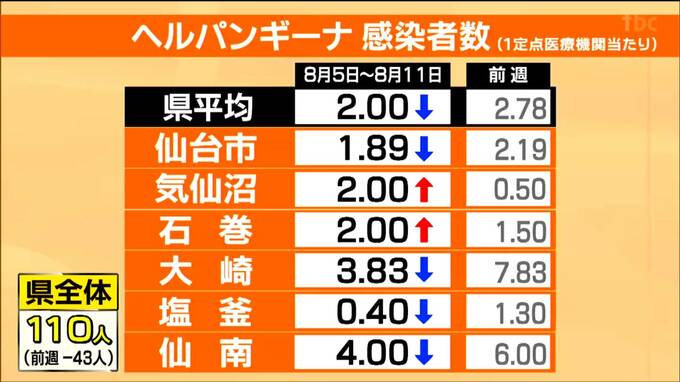 また、乳幼児を中心に夏に流行しやすい感染症「ヘルパンギーナ」の県内の新規感染者数は55定点医療機関であわせて110人で前の週から43人減ったものの、仙南と大崎保健所管内で警報が継続しています。