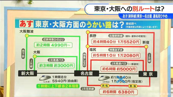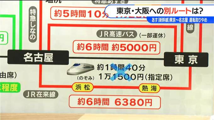 まずは名古屋から東京に行きたい場合、新幹線が運行しないということで、バスを見てみましょう。JRの高速バスなんですが、およそ6時間で5000円ということなんですね。ただし、一部、明日運休の便があるということです。ご注意ください。