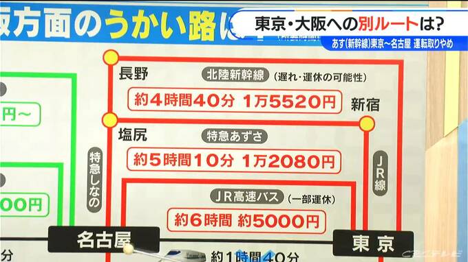 名古屋から特急「しなの」号で塩尻まで行き、ここで特急「あずさ」号に乗り換えて新宿まで出て、新宿から東京はJRということで、こちらは所要時間がおよそ5時間10分で、料金1万2080円ということです。