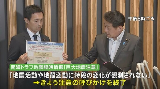 今月8日に初めて発表された南海トラフ地震臨時情報巨大地震注意について政府は「地震活動や地殻変動に特段の変化が観測されない」として、きょう15日に注意の呼びかけを終了しました。