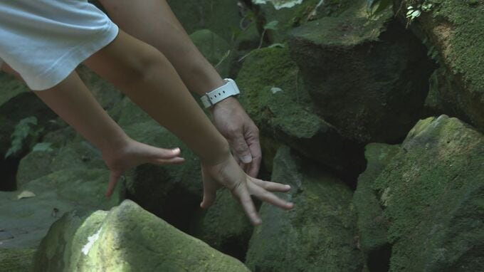 いくつもの岩の隙間から冷たい風が出てきています。溶岩にしみこんだ水が蒸発するときに回りの熱を奪うため涼しい風に変わるといわれています。