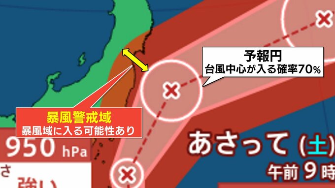 今回の台風7号の場合、予報円の西側を台風が進んだ場合、関東地方の広い範囲や東北の一部が暴風域に入る可能性があることを示しています。
