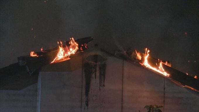 「甲州市塩山赤尾です。住宅の天井から火が上がっていて懸命な消火活動が行われています」