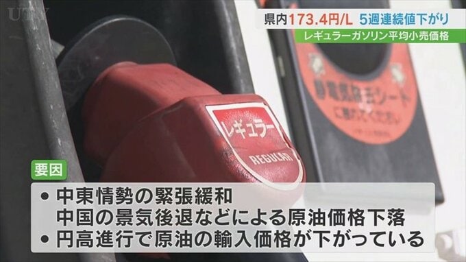 山梨県内のレギュラーガソリンの平均小売価格が発表され1Lあたり173.4円で5週連続の値下がりとなりました。
