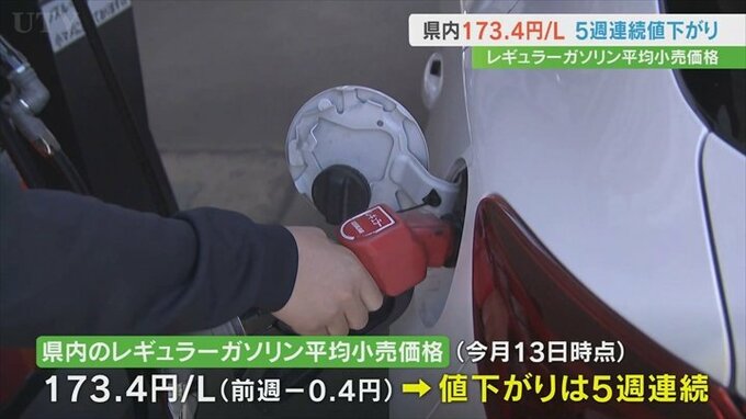 資源エネルギー庁によりますと8月13日時点の県内のレギュラーガソリンの平均小売価格は1Lあたり173.4円で前の週より0.4円値下がりしました。
