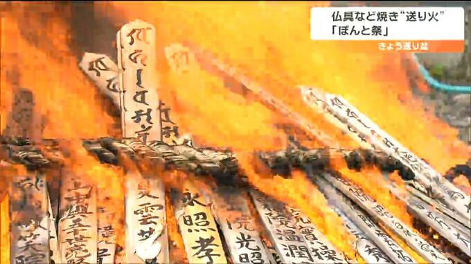 送り盆の16日、仙台市内の寺では不要になった仏具などを焼いて送り火とする「ぼんと祭」が行われました。仙台市青葉区八幡の龍宝寺で行われた「ぼんと祭」には、檀家や地域住民およそ250人が参加しました。住職に…
