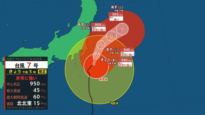 非常に強い台風第7号は、16日午後4時には銚子市の南南東にあって、1時間におよそ15㎞の速さで北北東へ進んでいます。中心の気圧は950hPa、中心付近の最大風速は45m、最大瞬間風速は60mで中心の南東側165㎞以内と北西側95㎞以内では風速25m以上の暴風となっています。
