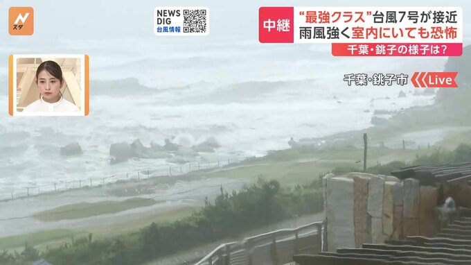 非常に強い勢力を維持したまま、関東の東を北上している台風7号。各地で雨や風が強まってきています。台風が接近している千葉県の銚子から、高柳アナウンサーが中継でお伝えします。依然として強い風がこの大きな…