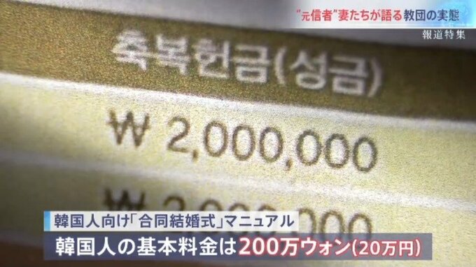 報道特集が入手した、韓国人向けの「合同結婚式」のマニュアルでは、基本料金は日本人のよりも安い200万ウォン、日本円にして20万円とされていた。