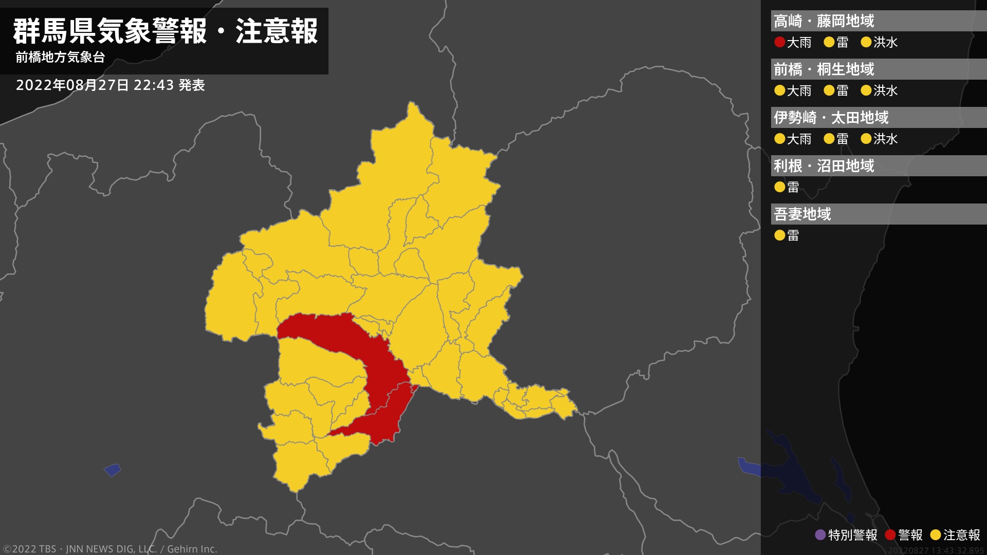 【大雨警報】群馬県・高崎市、藤岡市に発表 TBSテレビ 2022年8月27日(土) 22:43 地震・災害 気象台は、午後10時43分に、大雨警報(浸水害)を高崎市、藤岡市に発表しました。南部では、28日未明まで低い土地の浸水に警戒してください。【警報(発表中)と予報値】■高崎市□大雨警報【発表】・浸水 28日未明にかけて警戒 1時間最大雨量 40mm■藤岡市□大雨警報【発表】・浸水 28日未明にかけて警戒 1時間最大雨量 25mm