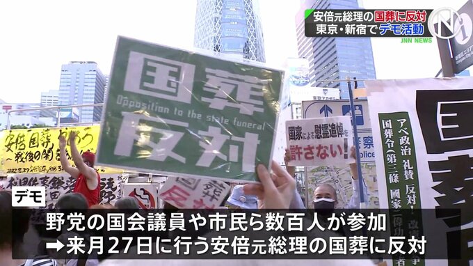 27日夕方、東京・新宿で野党の国会議員や市民らが安倍元総理の国葬に反対するデモを行いました。「国葬やめよう!国葬やめよう!」午後5時から新宿駅西口広場で行われたデモには、野党の国会議員や市民ら数百人が…