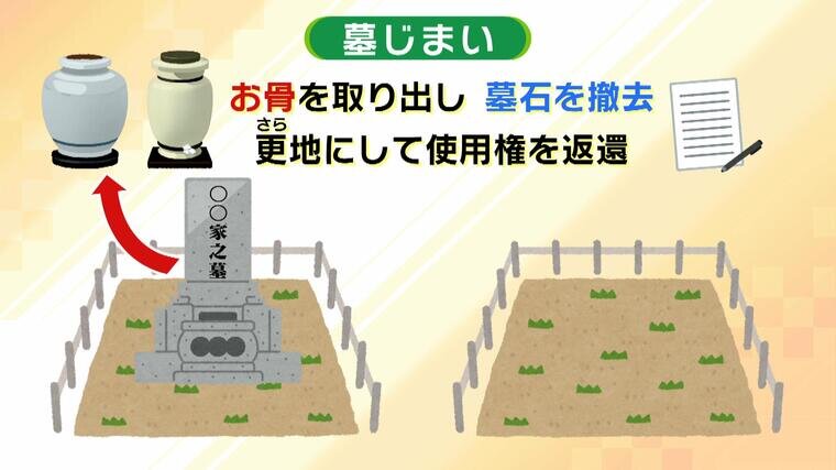 そもそも「墓じまい」とはー墓に眠る先祖代々の骨を取り出して違う場所に移動し、墓石も撤去。場所は更地にして返還するということです。行政などでは『改葬』とも言われています。