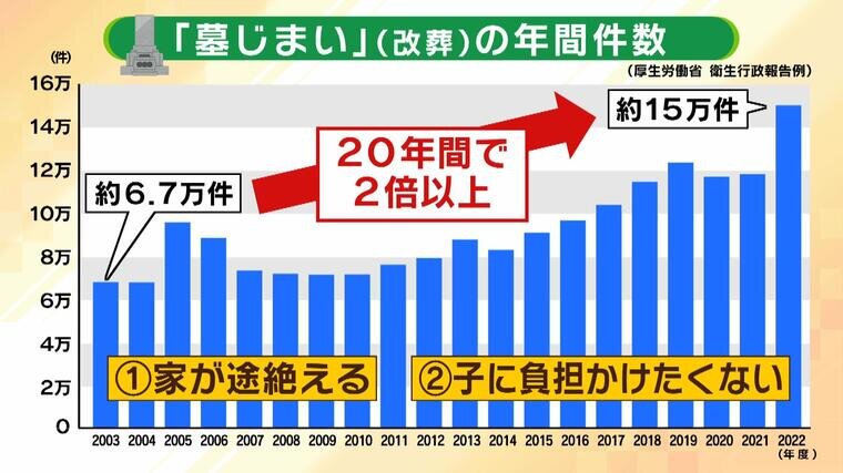 墓じまいの件数は20年で倍以上に急増しているというデータも。その背景には墓だけではなく、葬式も含めて、簡素化していこうという時代の流れがありました。さらに「家族の形の変化」や「経済的理由」、「宗教的な繋がりが生活から離れつつある」ということも要因に。先祖や両親を思う気持ちは変わらないですが、多様化が進んでいるのかもしれません。