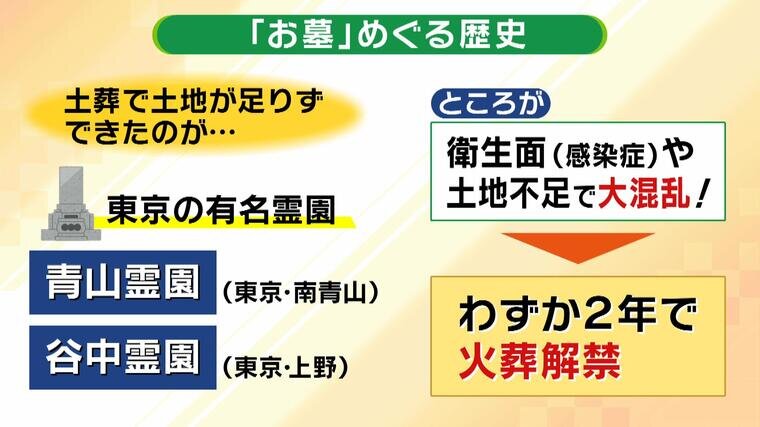 ところが衛生面で感染症伝染病であったり、土地不足で大混乱して、この土葬はわずか2年で火葬に戻されることになりました。