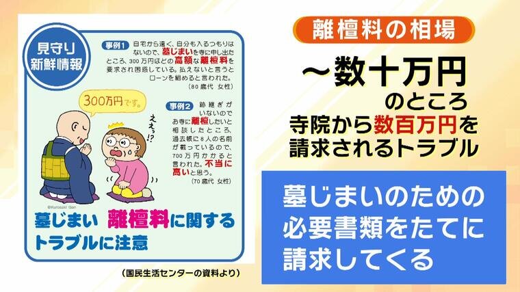 例えば寺や霊園から出るときに「離壇料=檀家を離れるためのお金」が必要でトラブルになるケースがあるようです。国民生活センターからも情報が出るほどで、しょうがないのかと思って払うのは、少し考える必要があるかもしれません。