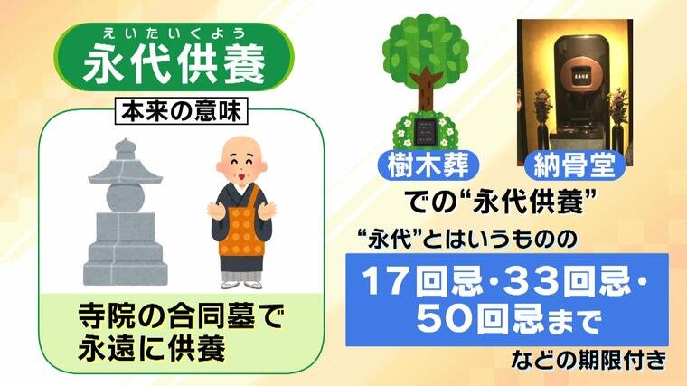 本来の意味は、一般的な個別のお墓ではなく、身寄りがいないなどの理由から、合同で複数のお骨を入れ、お寺や霊園で面倒を見るいう意味合いでしたが、最近は樹木葬や納骨堂で永代供養とうたいながら実際期限がついているものがあるといいます。