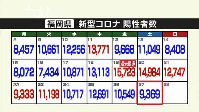 新型コロナウイルスについて福岡県は27日新たに9369人の陽性を発表しました。福岡県の一日ごとの陽性者数を示すカレンダーです。27日は9369人で5日ぶりに1万人を下回りました。発表自治体別の内…
