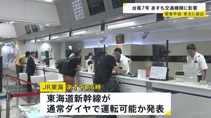 非常に強い台風7号は、今夜からあす明け方にかけ、関東甲信や東北に近づいていて、あすも交通機関に影響が出そうです。東海道新幹線はきょう、東京―名古屋間の上下線で終日運転を見合わせていますが、JR東海によ…