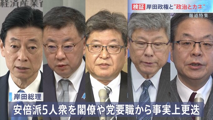 1か月後、岸田総理は安倍派の幹部、いわゆる安倍派五人衆の松野官房長官や萩生田政調会長らを閣僚や党要職から事実上更迭した。