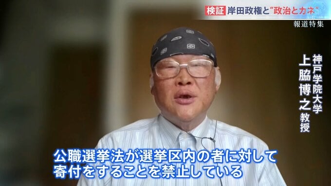 政治資金問題の第一人者、神戸学院大学の上脇教授は、祝賀会の発起人代表が岸田総理であることは問題だと指摘する。