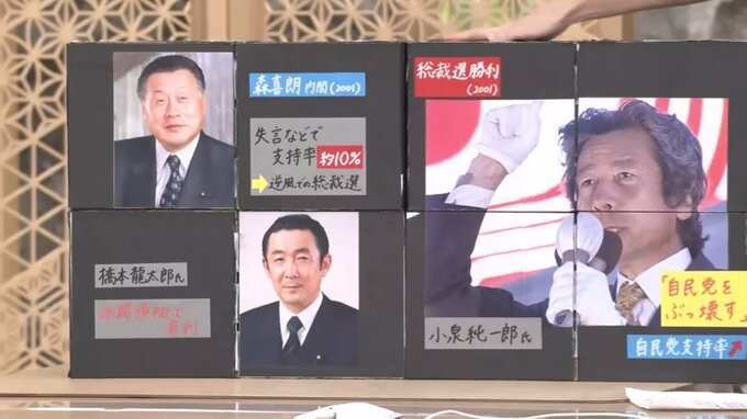 当初は、派閥領袖の橋本龍太郎氏が有利とみられていましたが、勝ったのは、「自民党をぶっ壊す」と叫んだ小泉純一郎氏。これで一気に、自民党の支持率も回復したのです。