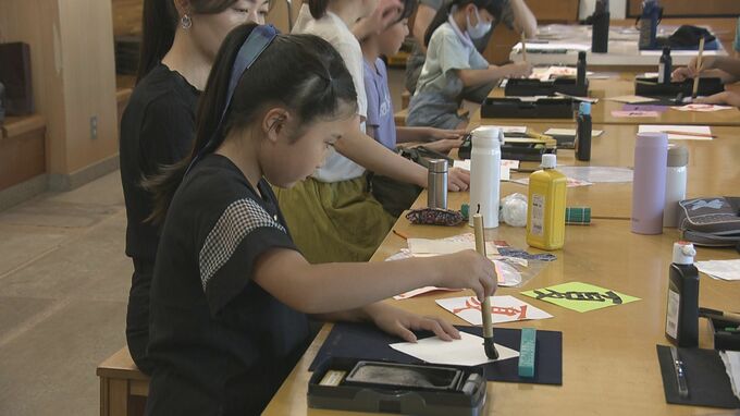 事前に申し込みのあった児童19人が参加し、茂住さんが書いたお手本をまねしながら子どもたちはそれぞれの好きな言葉を真剣な表情で書き、涼しげなうちわを完成させていました。
