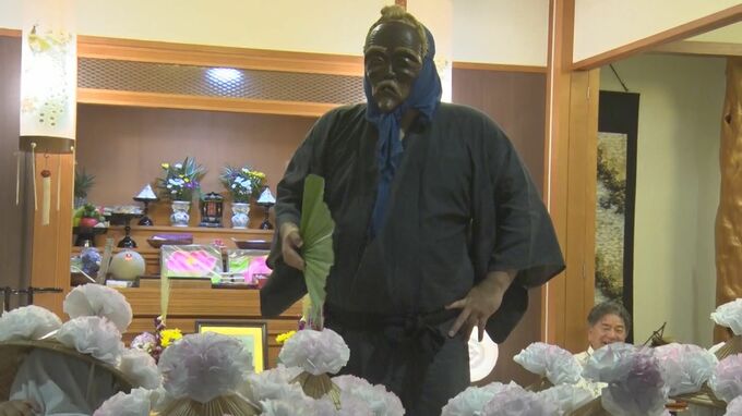 午後10時すぎ、石垣市石垣の大濵さんの家にアンガマの一行が訪れると、仏壇に手を合わせ、踊りや三線の演奏で先祖を供養します。