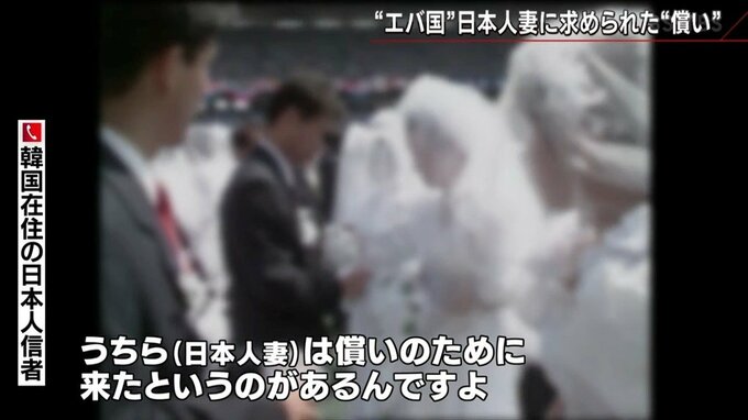 番組では今、韓国在住で合同結婚式で結婚した現役信者に話を聞くことができた。日本にいる時のように献金の強要はなくなったという。韓国人と嫁ぐことが免罪符のようになっていると言うが、中には借金があったり、働いていないような「あれ?」と思うような人と結婚させられた人もいるという。しかし、それも“日本は償わねばならない” という教団の教えによって心の中で封じ込めされているようマインドコントロールされているようだ。