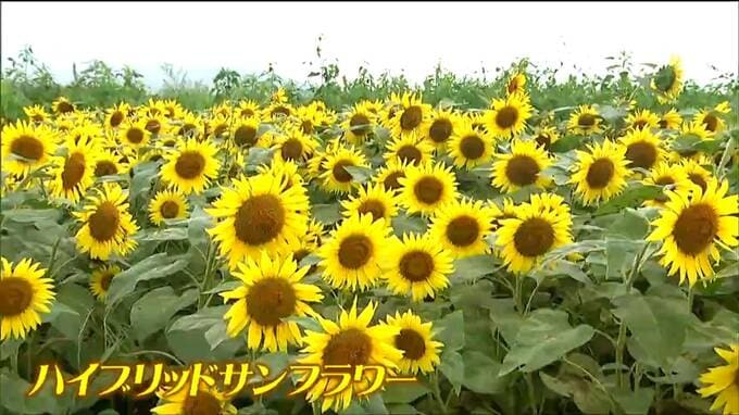 亘理町逢隈にある2.5ヘクタールの花畑には6月に地元の小・中学生や住民が種を撒いた「ハイブリッドサンフラワー」という品種の45万本のヒマワリが咲いています。